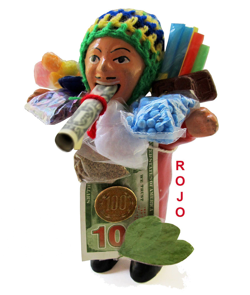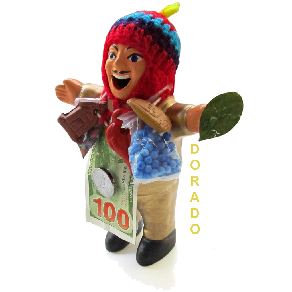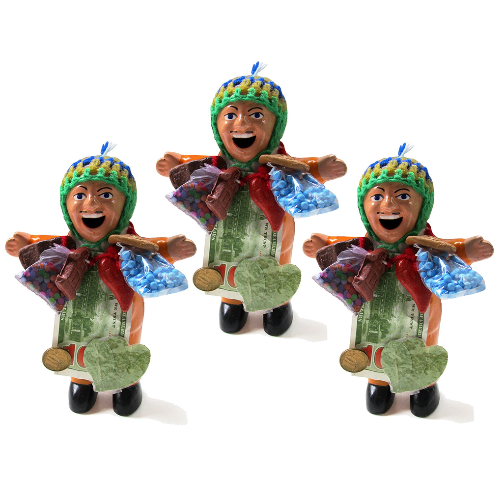 Lote de 3 ekekos fumador fortuna de cerámica de 19x14x10cm. Incluye: moneda Bolivia o Latinoamérica (real) y hojasdecoca (reales). Un dólar billete ($100 de cotillón) y otros elementos (cotillón) de la suerte/abundancia: casa, corazón y comida.