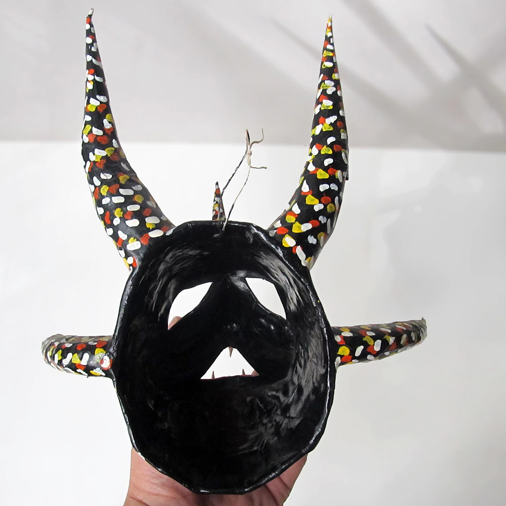 Mascara de coleccion de diablo vejigante tipica de puerto rico de papel mache de 27x17x7cm con 5 cuernos superior. Incluye gancho para colgar.