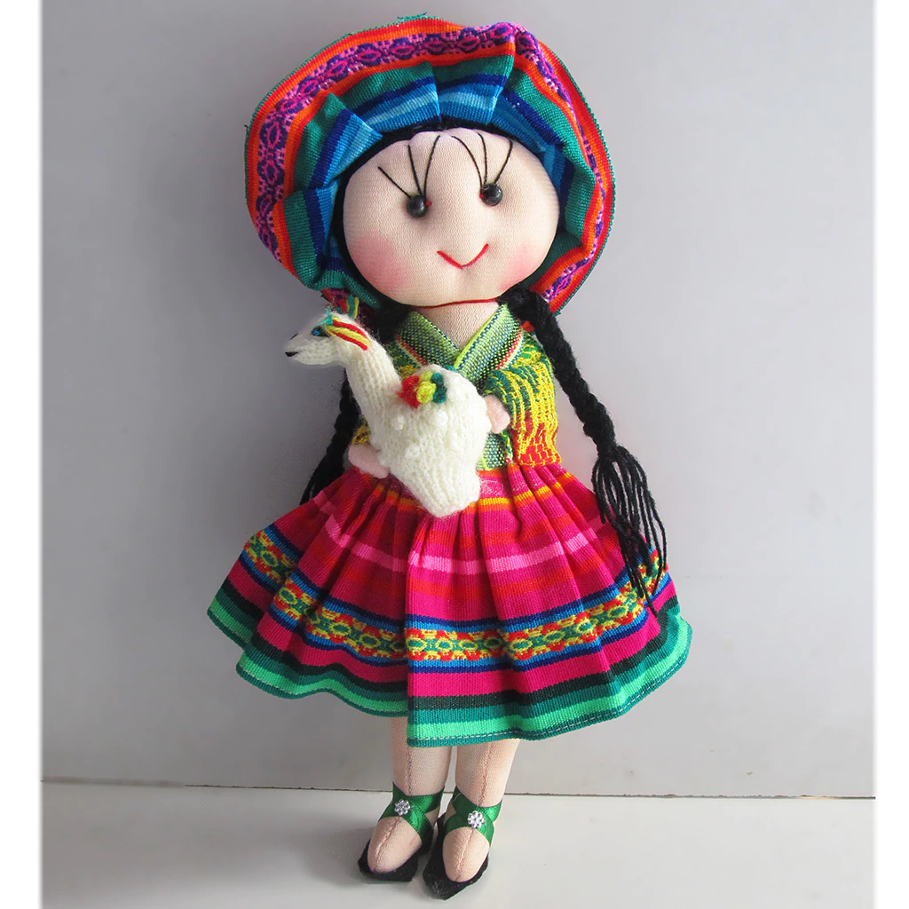 Muñeca artesanal andina (chola) con falda de awayo, su bebe o llamita y sombrero típico de 30cm.