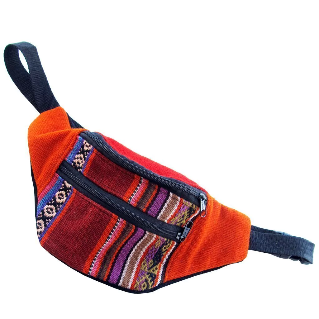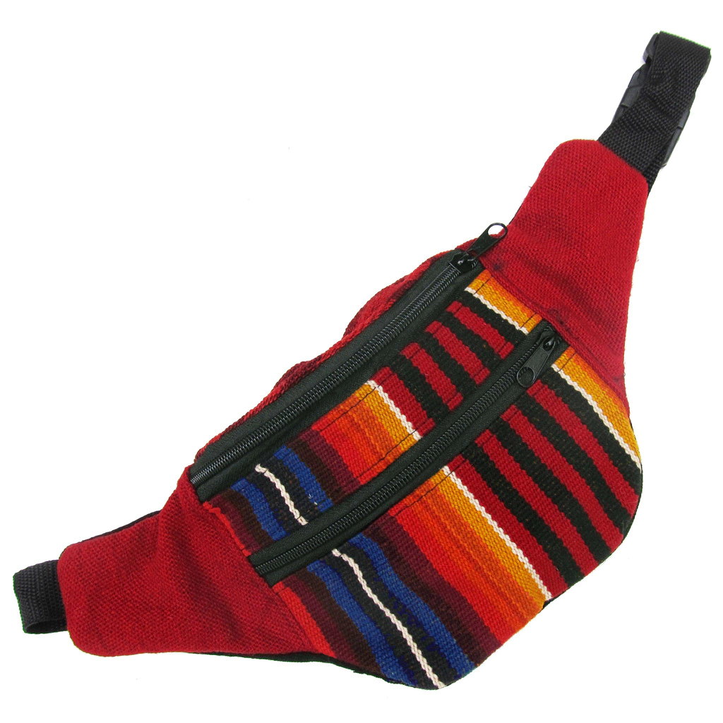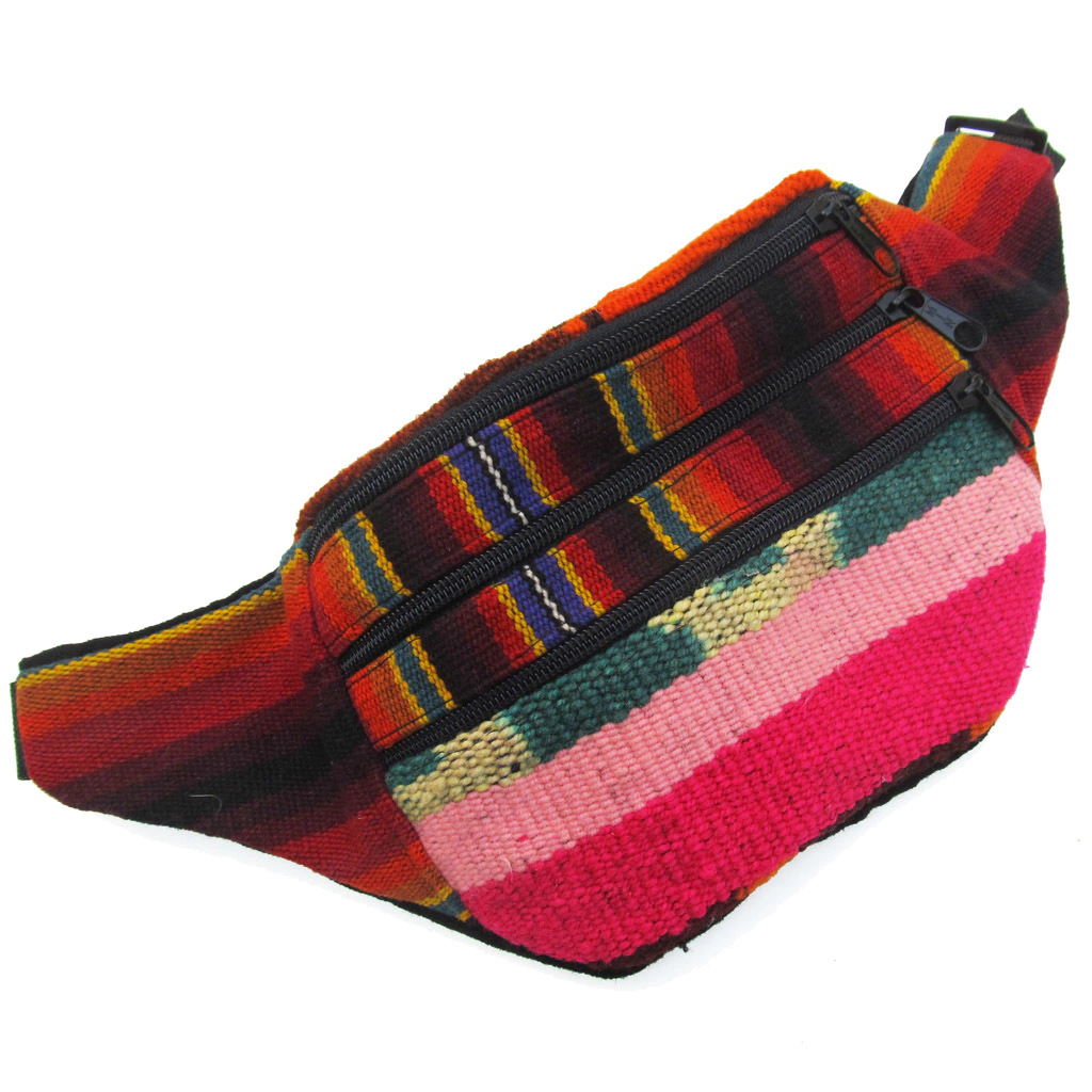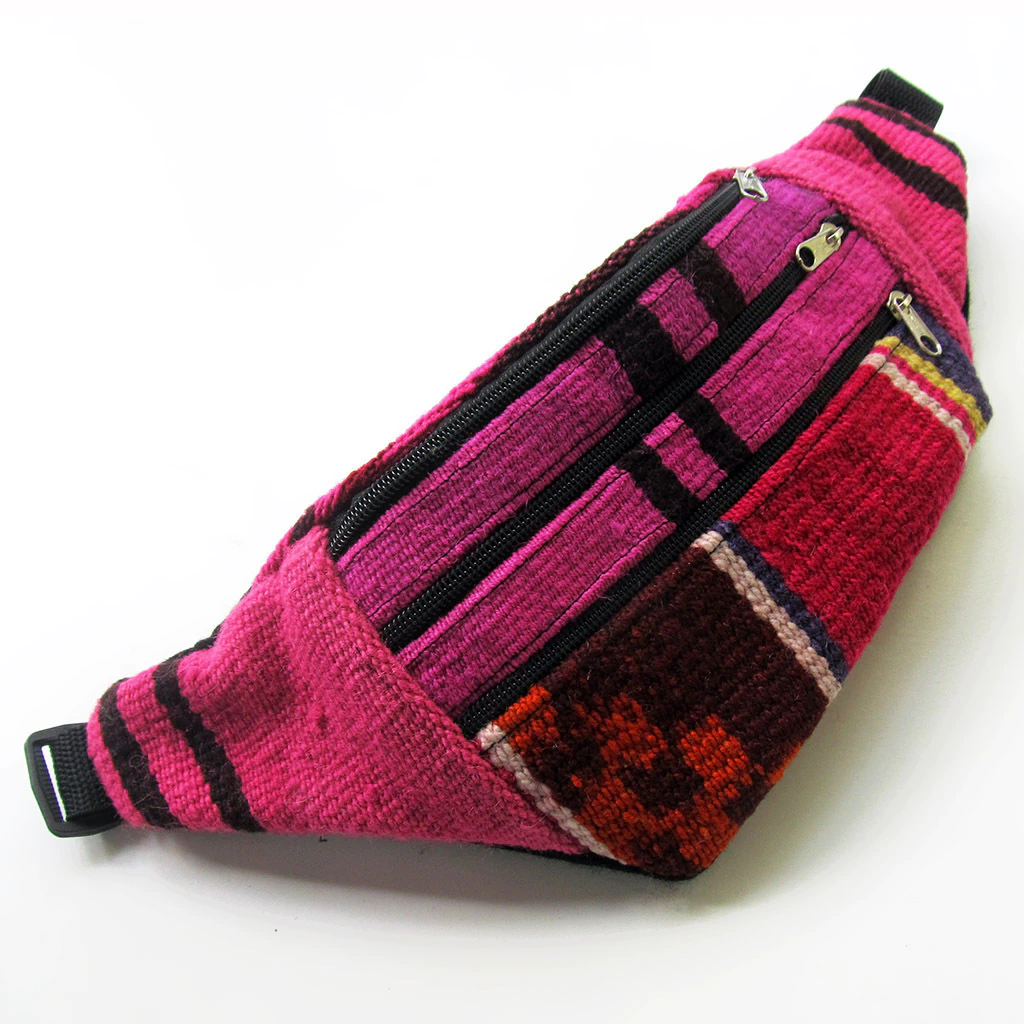 Riñonera artesanal de telar de 35x13cm con 2 ó 3 bolsillos en el frente, dependiendo el modelo.